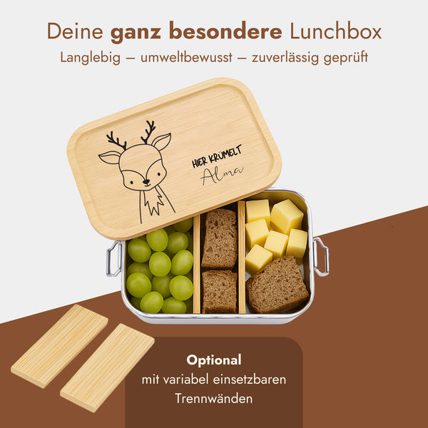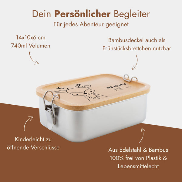 Nachhaltige Kinder-Brotdose aus Edelstahl (740 ml) mit individuell graviertem Bambusdeckel. Ideal für die Schultüte & den ersten Schultag. BPA-frei, lebensmittelecht, sicherer Verschluss. Edelstahlteil spülmaschinenfest, Deckel/Divider Handreinigung. Ordnung, Stil & Sicherheit für jeden Schultag.