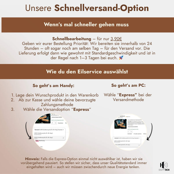 Die Bearbeitung deiner Bestellung beträgt 1-3 Werktage. Die Lieferzeit bei sofort verfügbaren Produkten beträgt 2-3 Werktage.